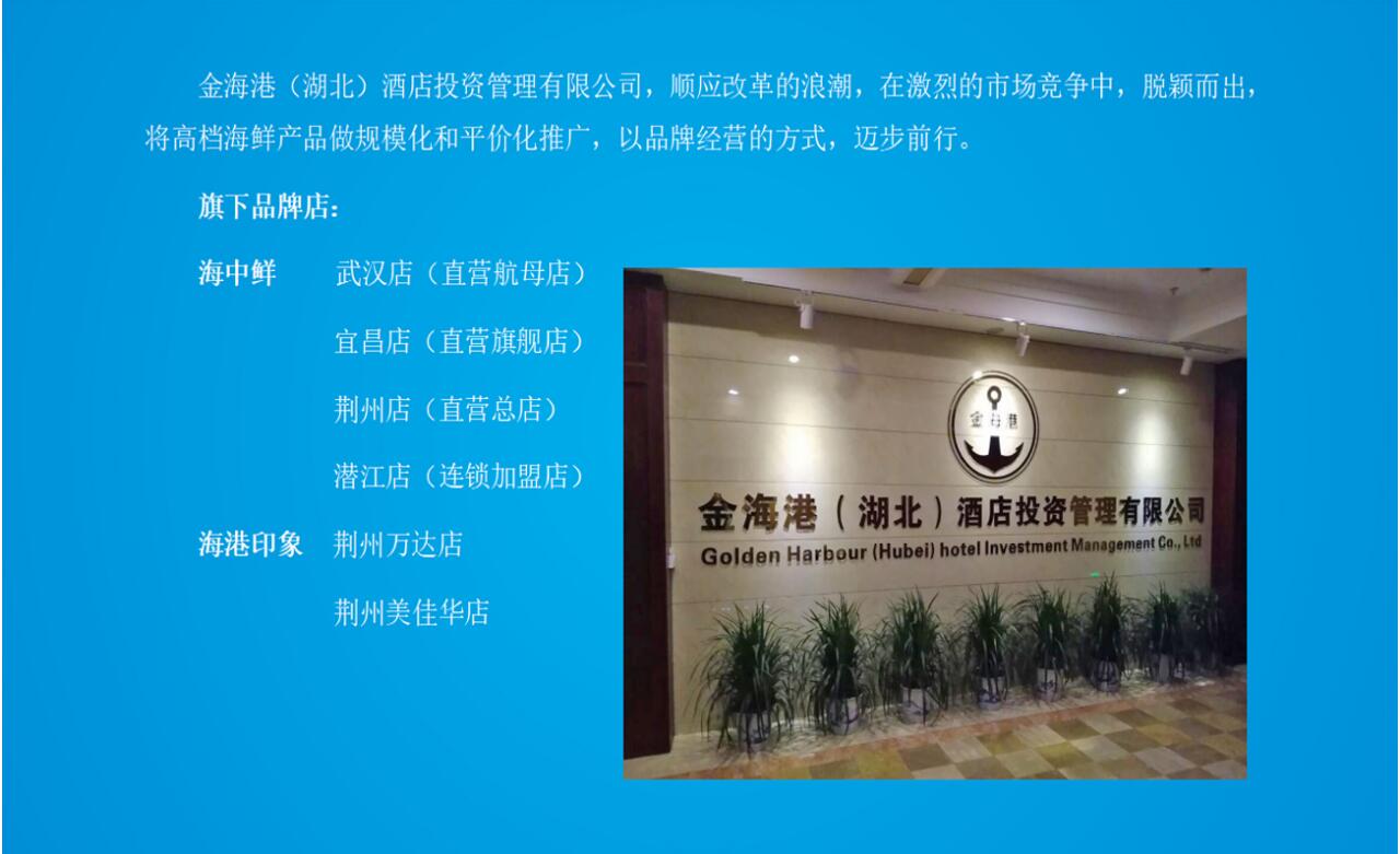 金海港(湖北)酒店投资管理有限公司,是集海鲜采供、物流配送、品牌门店、加盟推广于一体的酒店投资管理公司。