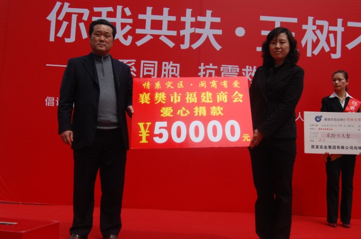 4月14日,青海玉树发生7.1级地震,地震无情,人间有爱。4月18日,襄樊市慈善总会、民发集团、襄樊人民广播电台联合举办了“你我共扶·玉树不倒”赈灾捐款活动。在活动的现场,社会各界纷纷伸出援助之手,襄樊市福建商会当场捐款5万元,民发集团及部分闽商企业捐款50万元,湖北海厦建设公司捐款4万元,襄樊华洋堂百货公司通过不同渠道捐款15万元,共向青海玉树地震灾区捐款74万元。